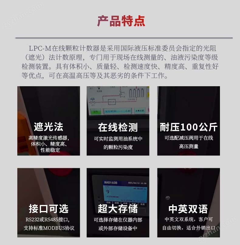 顆粒計數(shù)器,在線式顆粒度檢測儀采用光阻(遮光)法計數(shù)理,原是一款專門用于現(xiàn)場在線測量的、油液污染度等級檢測裝置。具有體積小、質(zhì)量輕、檢測速度快、精度高、重復(fù)性好等優(yōu)點,可在高溫高壓等及其惡劣的條件下工作。適用于發(fā)動機油、齒輪油、變壓器油(即絕緣油)、液壓油、潤滑油、合成油、水基類(水基液壓油、水乙二醇等)、醇類、酮類等一切透光溶劑。