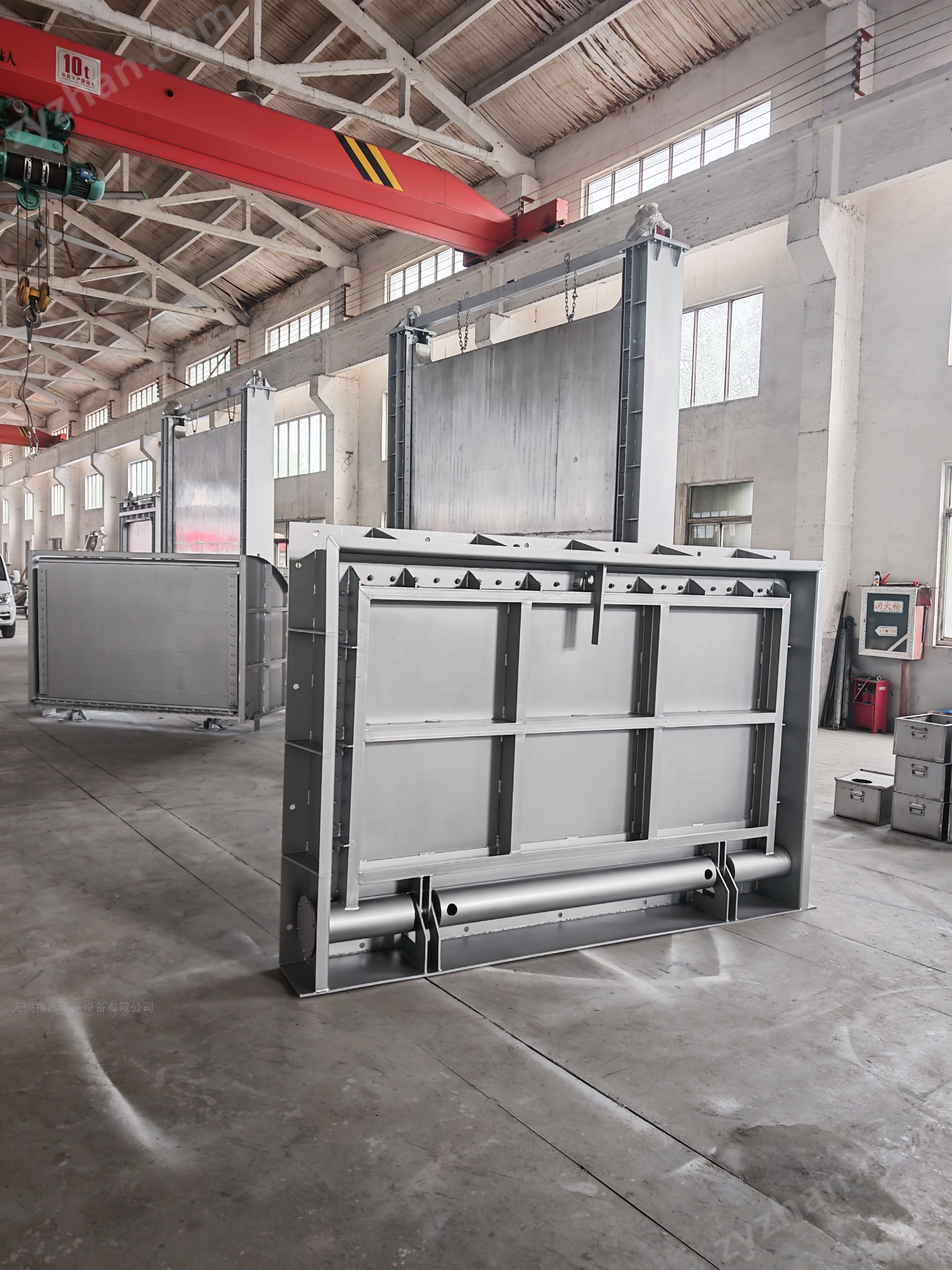 液動下開式堰門 ,液動旋轉(zhuǎn)堰門具備發(fā)貨 結(jié)構(gòu),圖中設(shè)備就是液動下開式堰門,主體為高強度碳鋼/不銹鋼焊接框架,中間是可垂直升降的堰板,四周配備密封膠條(圖中黑色邊框),實現(xiàn)三面/四面密封,底部帶加強筋安裝底座,頂部預(yù)留液壓驅(qū)動裝置安裝位,整體為非標(biāo)定制化結(jié)構(gòu),適配不同口徑的箱涵、渠道。