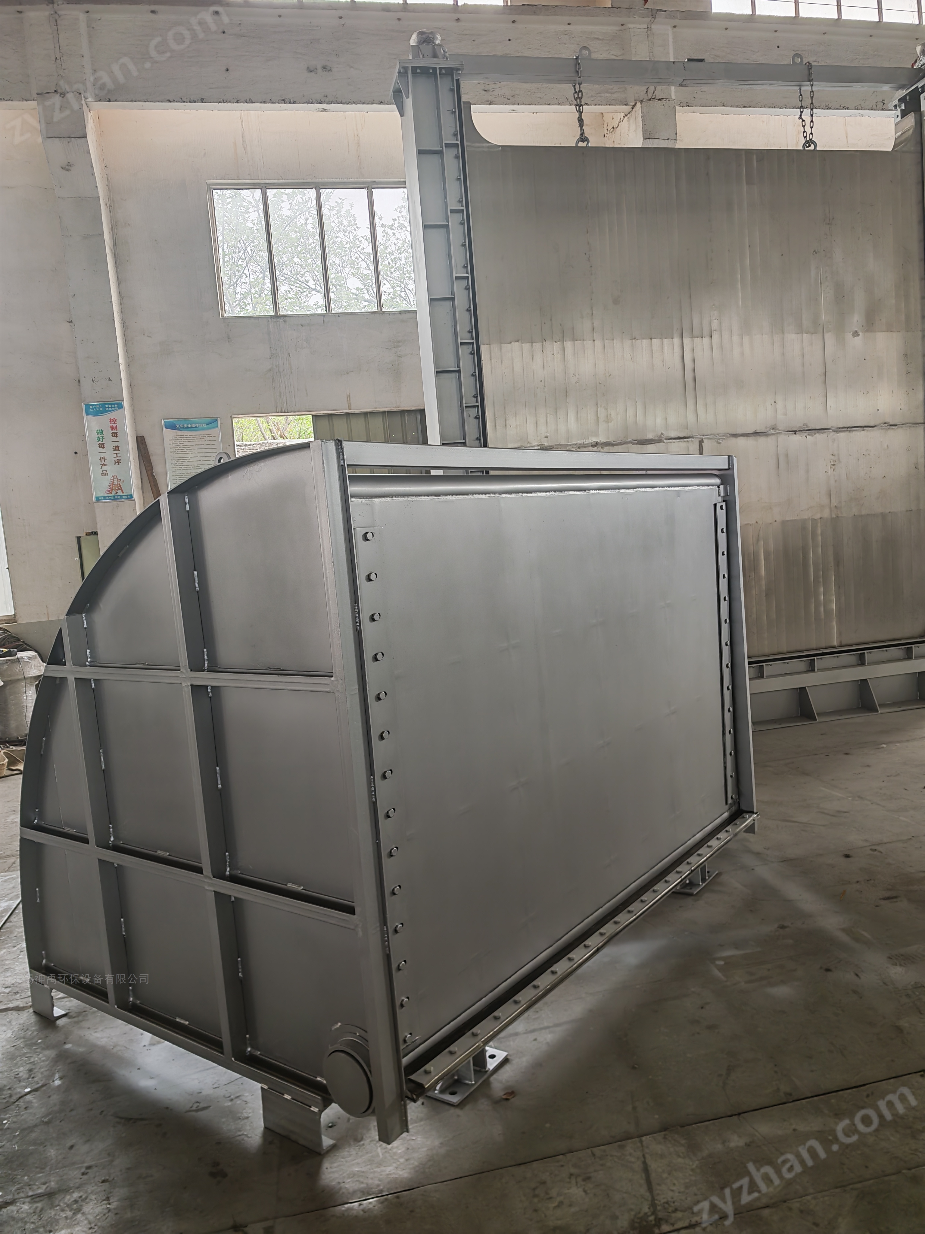 液動下開式堰門 ,液動旋轉(zhuǎn)堰門具備發(fā)貨 圖中設(shè)備就是液動旋轉(zhuǎn)堰門(也叫堰板式可調(diào)堰),主體為不銹鋼/碳鋼焊接的弧形框架結(jié)構(gòu),中間是帶加強筋的堰板,底部配備液壓驅(qū)動油缸(圖中橫向圓柱部件),整體為非標(biāo)定制化結(jié)構(gòu),適配不同尺寸的箱涵、渠道、截流井。